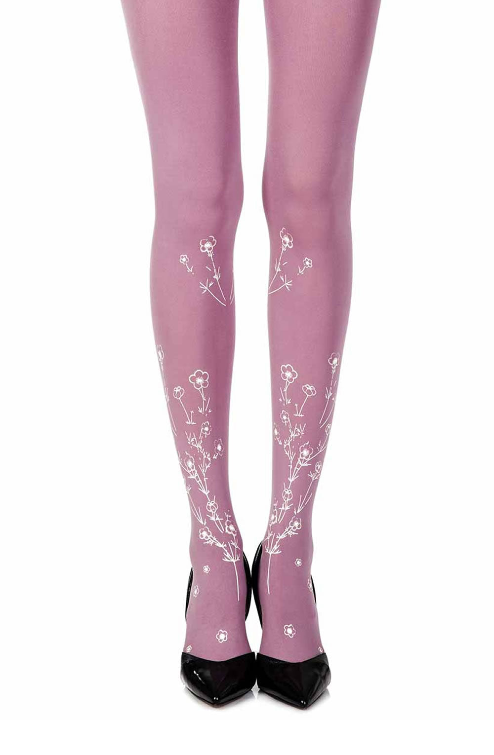 Opaque violet 120 denier tights with cream bouquet design that reminds you of a wild flower blooming field after the rain! The print is on both legs front and back.