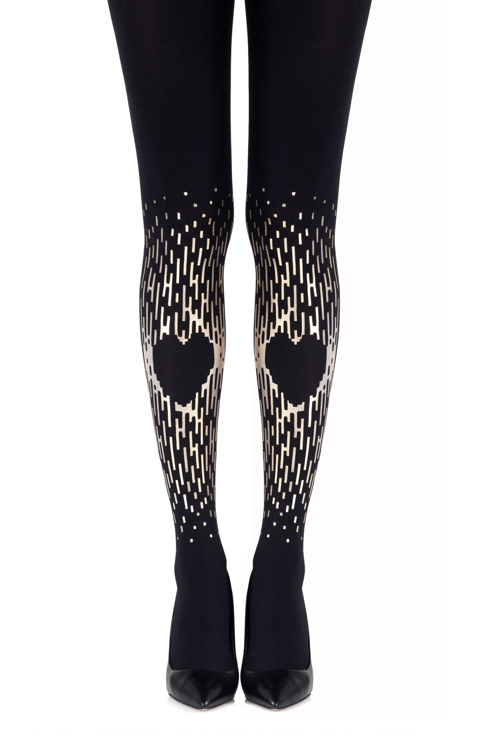 Love is all around with the Spread The Love tights that feature an emerging heart from an abstract graphic that is two-sided. We love actually. Colour: Black tights with Gold print. Thickness: 120 denier. No doubt you will shine with our metallic prints. Please note that these prints require extra care when washing and will naturally fade with wear. Unless they have X-ray vision no one will be able to see through these opaque tights. With an identical print on the front and back get ready for 360° visual impact. Hand print no two are the same.