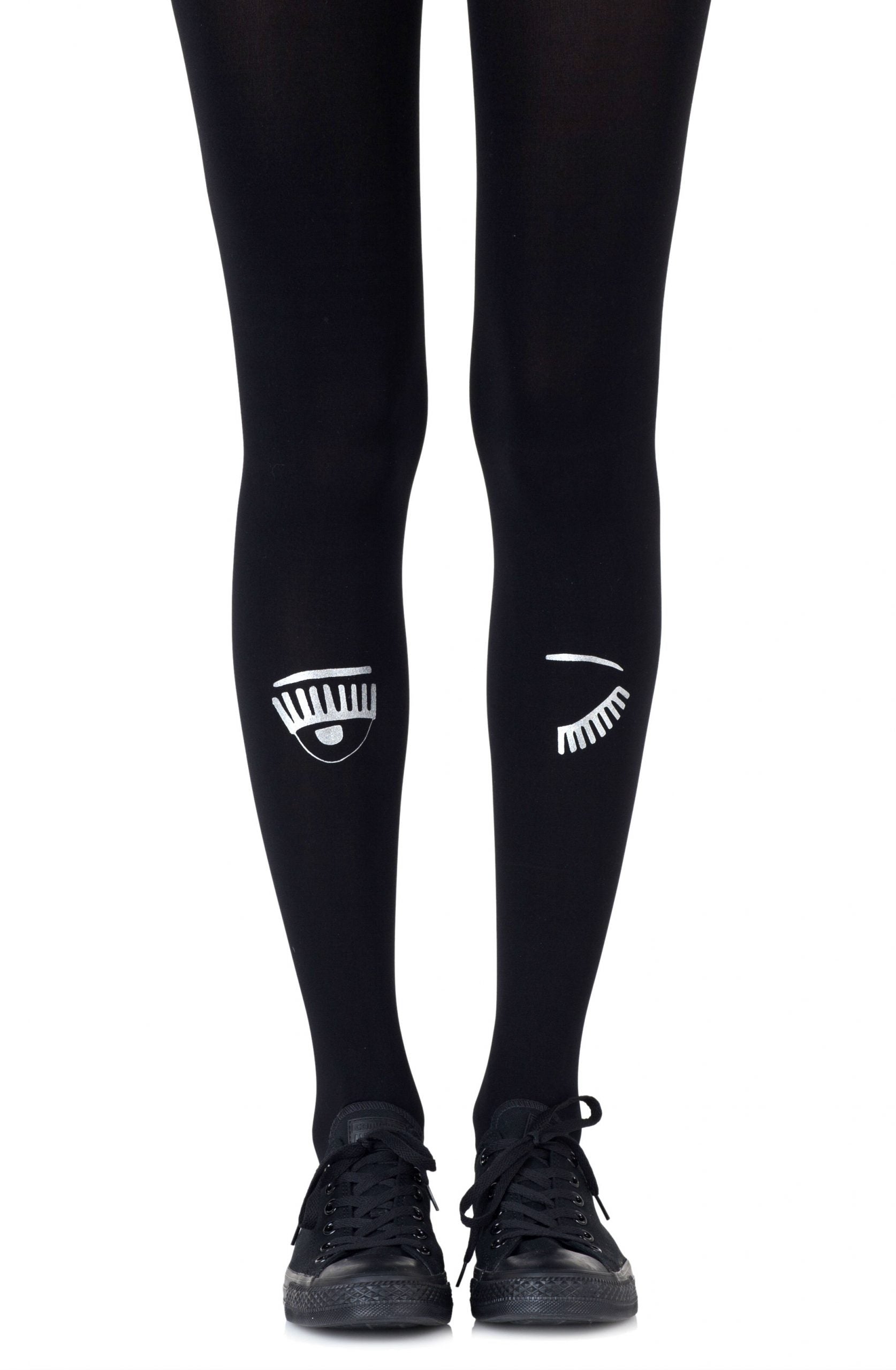 Flirt shamelessly with Wink Wink tights that feature a reversible winking eye. Grab your most coquettish dress and be totally irresistible. Colour: Black tights with Silver print. Thickness: 120 denier. No doubt you will shine with our metallic prints. Please note that these prints require extra care when washing and will naturally fade with wear. Unless they have X-ray vision no one will be able to see through these opaque tights. Is the party in the front or the back? You choose with reversible tights where to place all the fun. Hand print no two are the same.