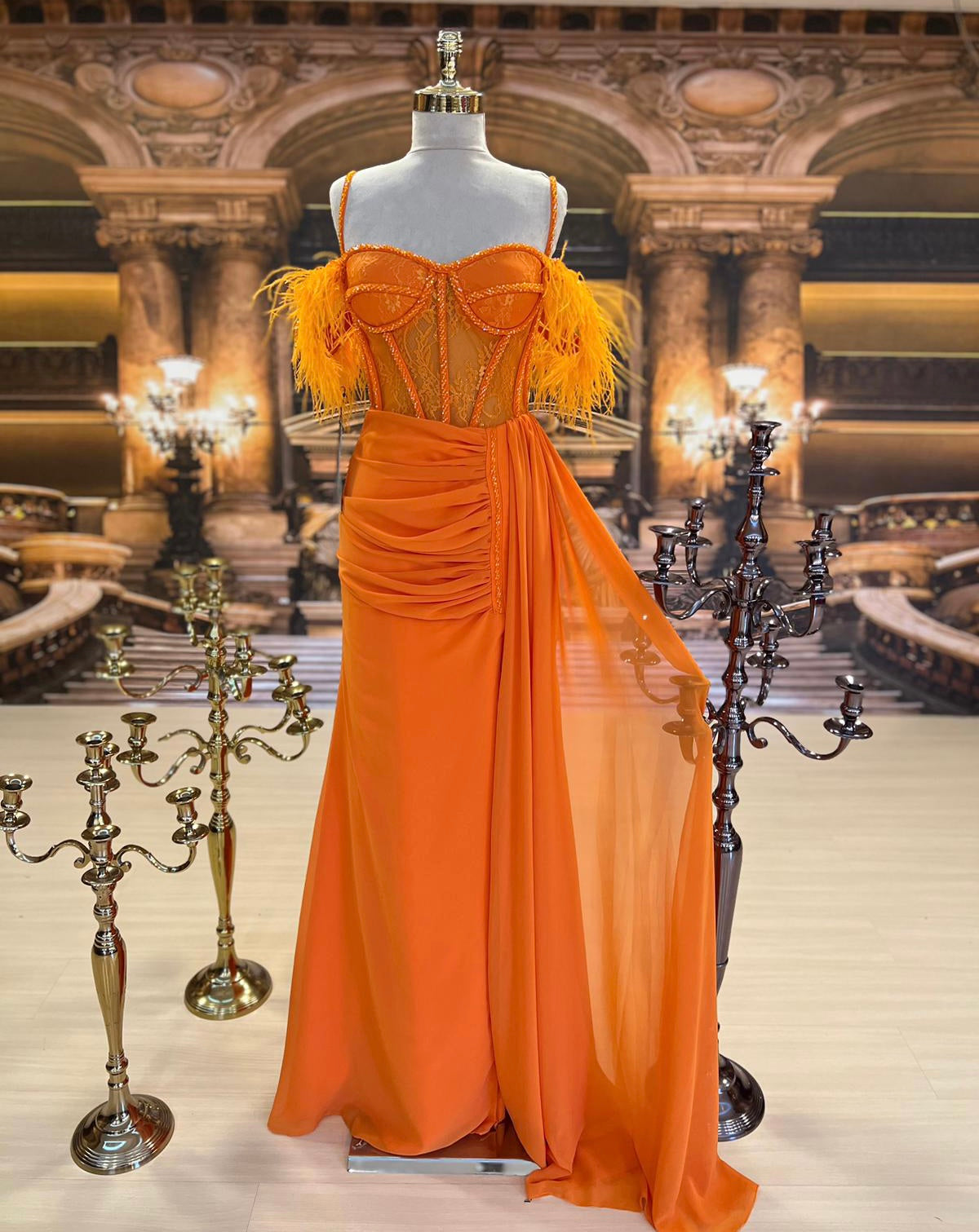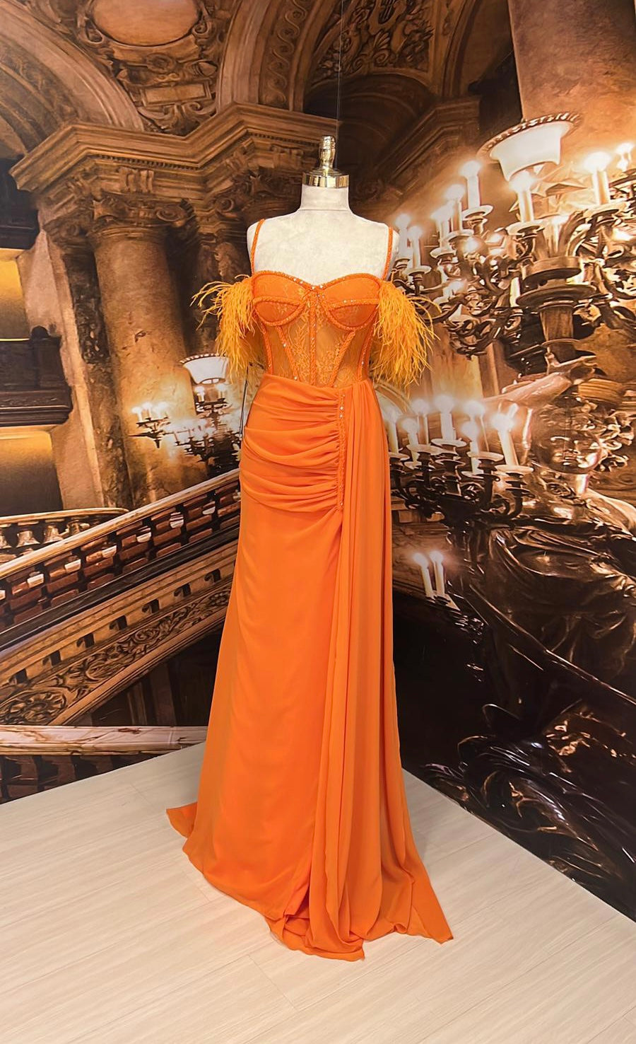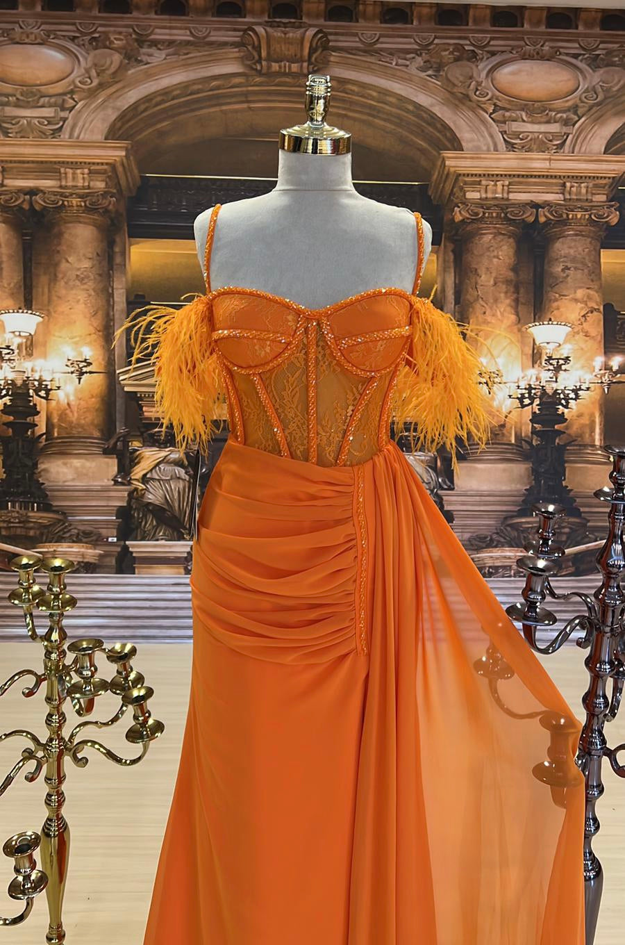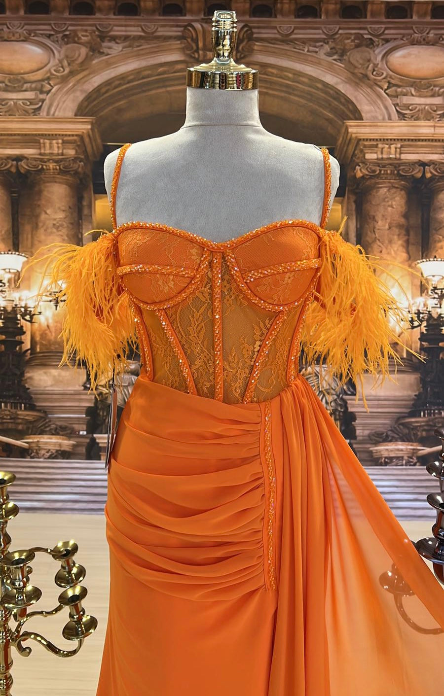 Curio Collection’s "Aliana Dress". This stunning orange feathered sleeve evening dress is intricately hand made from scratch and will most definitely make a statement at any glamorous event x