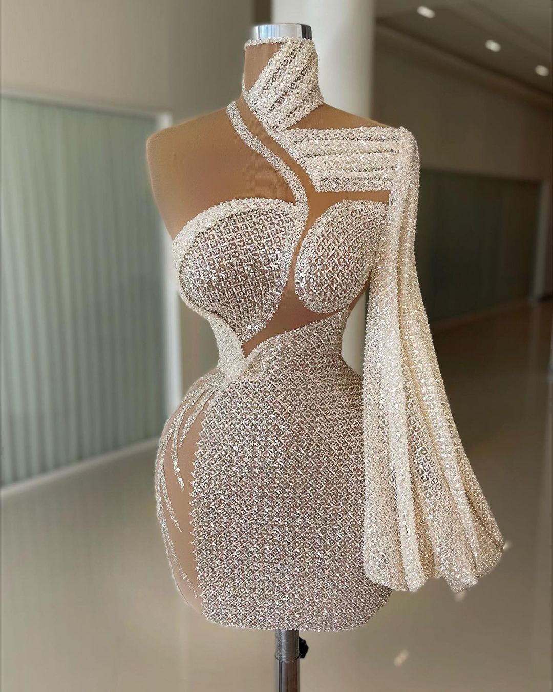 Curio Collection’s "Ashanti Dress". It is obvious that this nude and silver dress full of sequins and significant leaf detail transparent set on the one side of the thigh belong to those unforgettable winter or summer season fancy parties, but besides parties, this beautiful dress can be worn at more formal events due to the high neck and long puffy sleeve narrowing at the bottom. No matter what special occasion you attend, fancy parties or more formal events, in this silver dress full of sequins you’ll make a dazzling statement! This stunning one sleeve high neck evening dress is intricately hand made from scratch and will most definitely make a statement at any glamorous event. This short nude silver dress has the perfect touch of colour with the combination of two shades: nude and silver, so when it comes to accessories, it’s easier to combine this silver dress full of sequins with neutral colours such as nude that goes with everything! x
