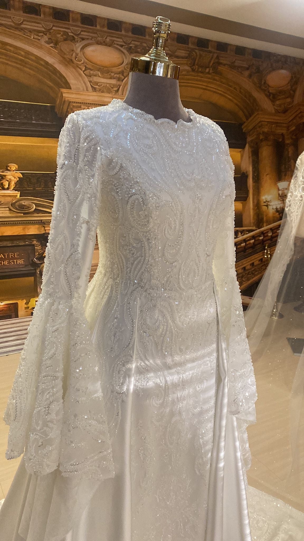 The structured silhouette is complemented by a graceful high neckline and sheer, softly draped sleeves, creating an effortlessly elegant balance of coverage and femininity. A flowing overskirt opens at the front to reveal an intricately embellished inner gown beneath, extending into a romantic train that moves beautifully with every step.