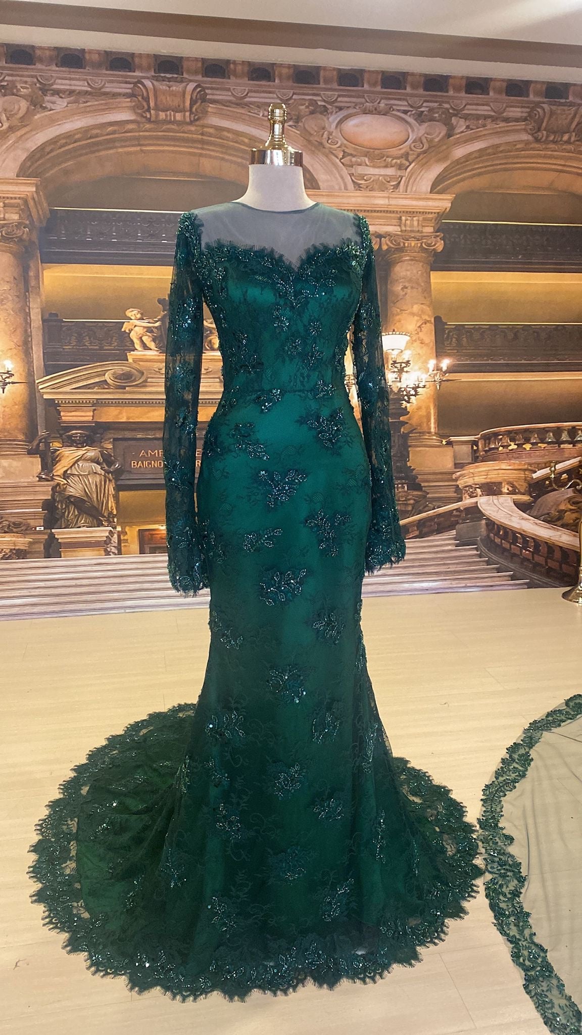The sheer corsetry creates a sculpted, flattering shape, while layers of airy tulle fall into a graceful full-length skirt, offering movement and elegance with every step. Subtle floral accents cascade throughout the design, creating a whimsical yet refined finish.