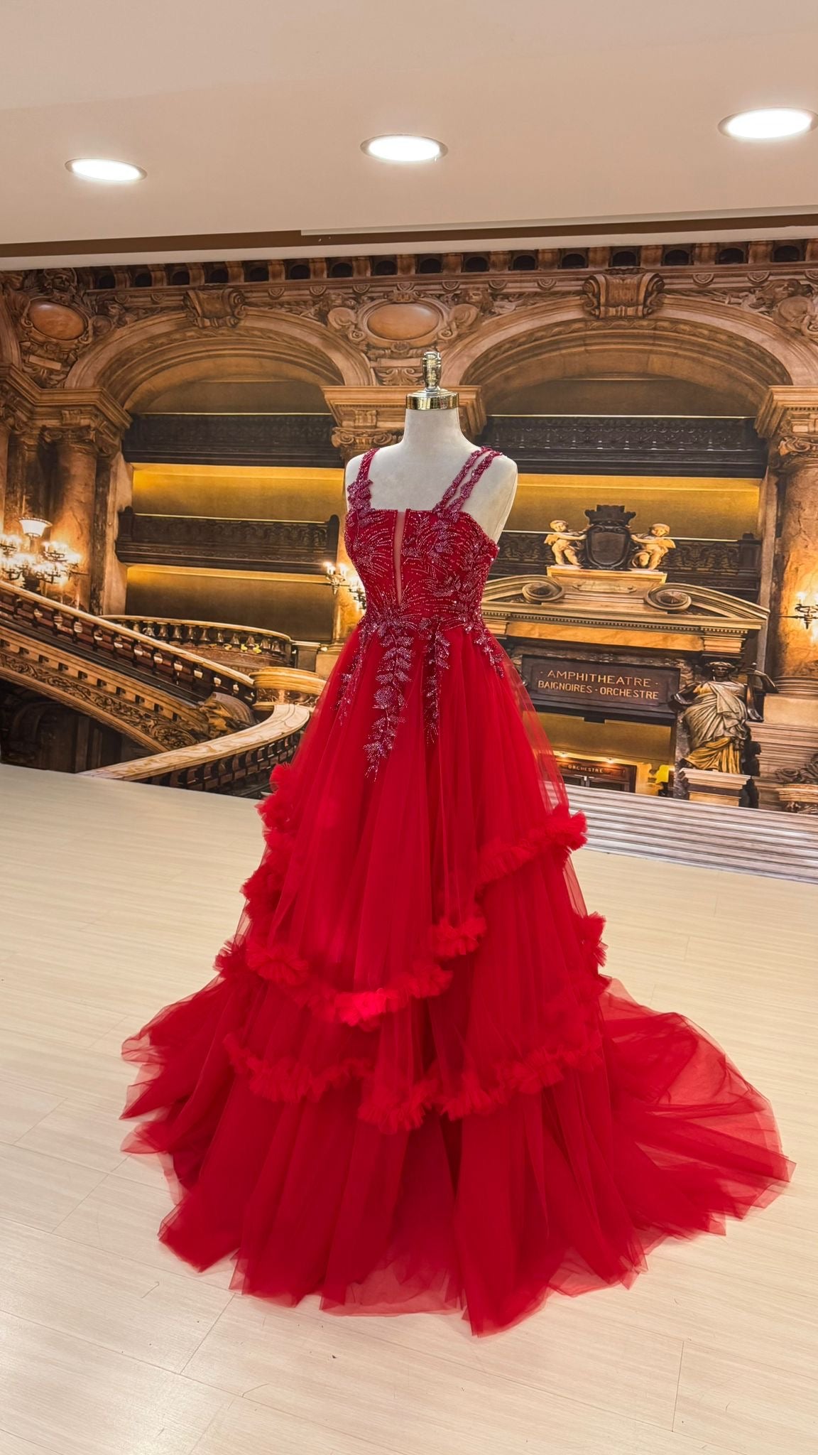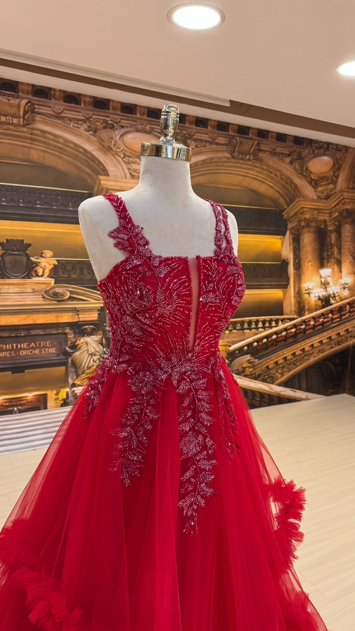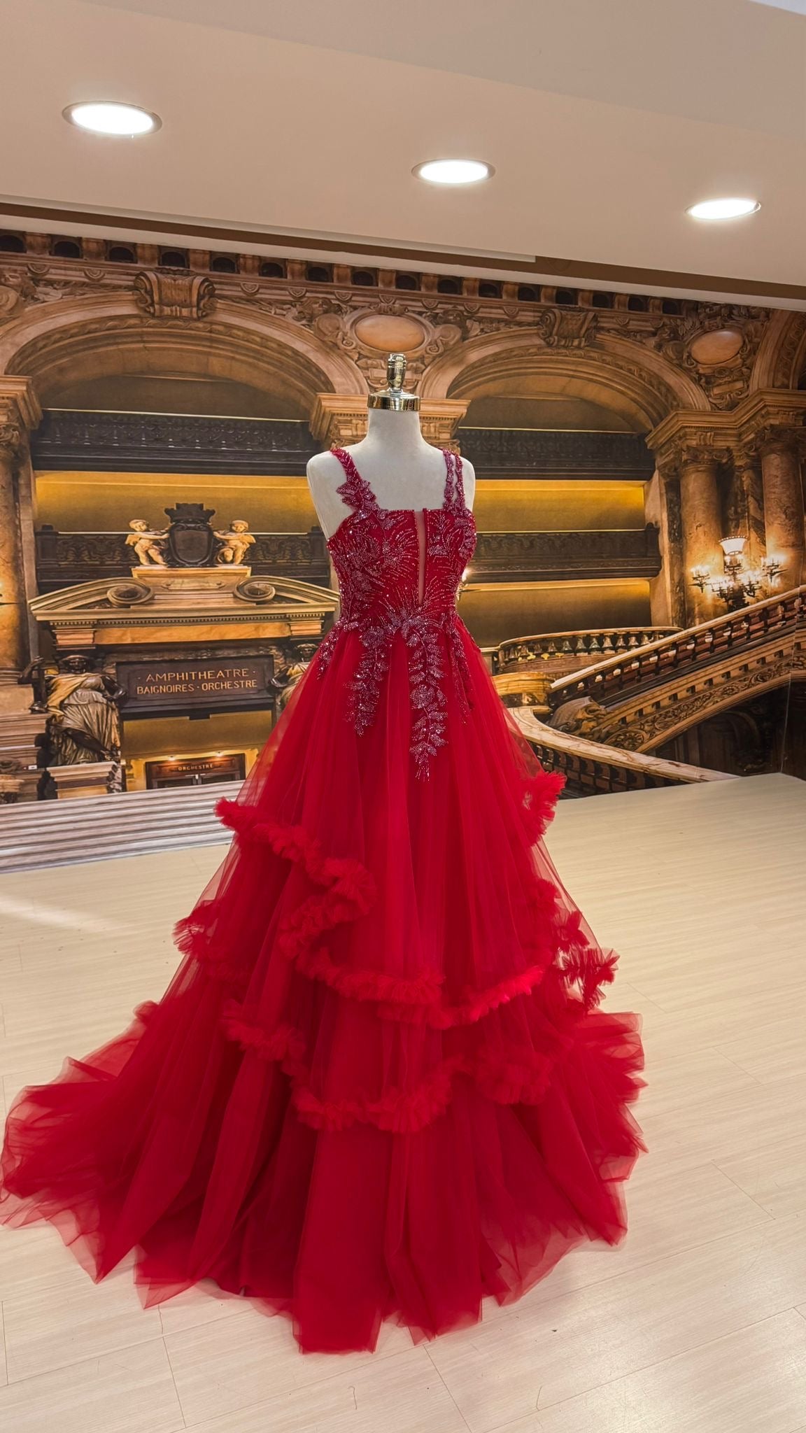 Crafted in a bold crimson tone, Fiorenza blends romantic detailing with high-fashion drama, making it the perfect statement gown for unforgettable occasions.