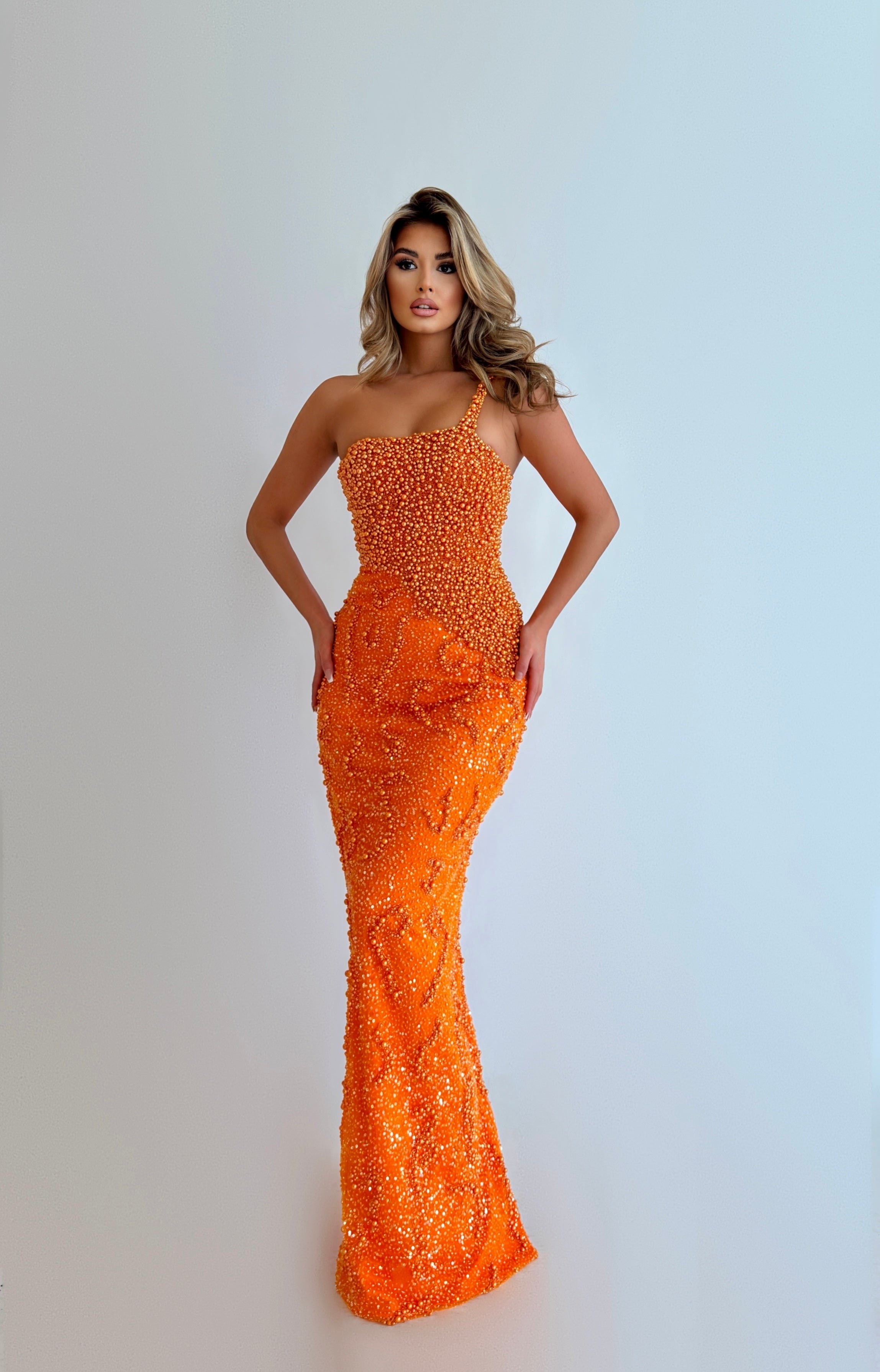Curio Collection’s "Katana Dress". This stunning orange one sleeved evening dress is intricately hand made from scratch and will most definitely make a statement at any glamorous event x