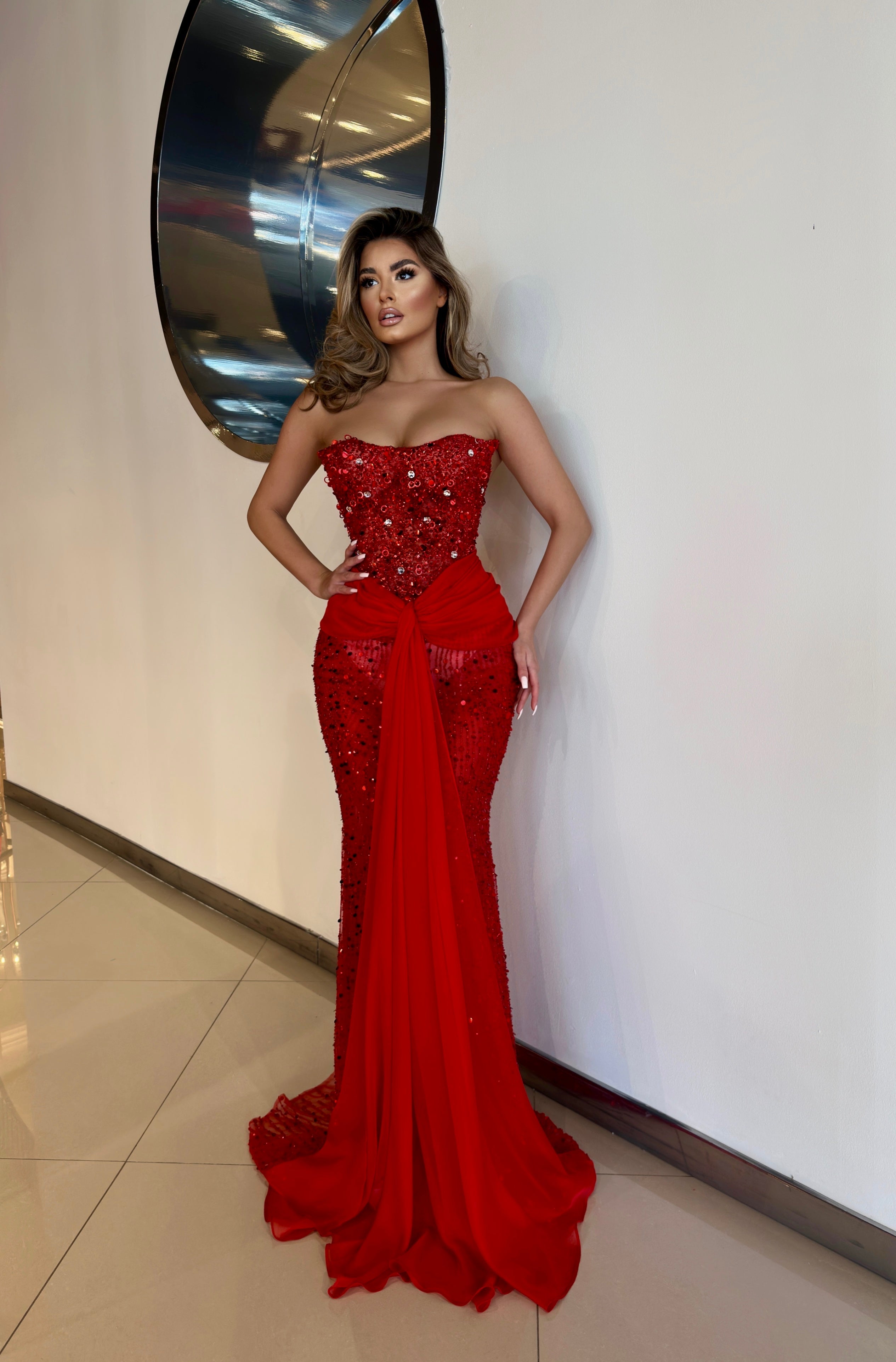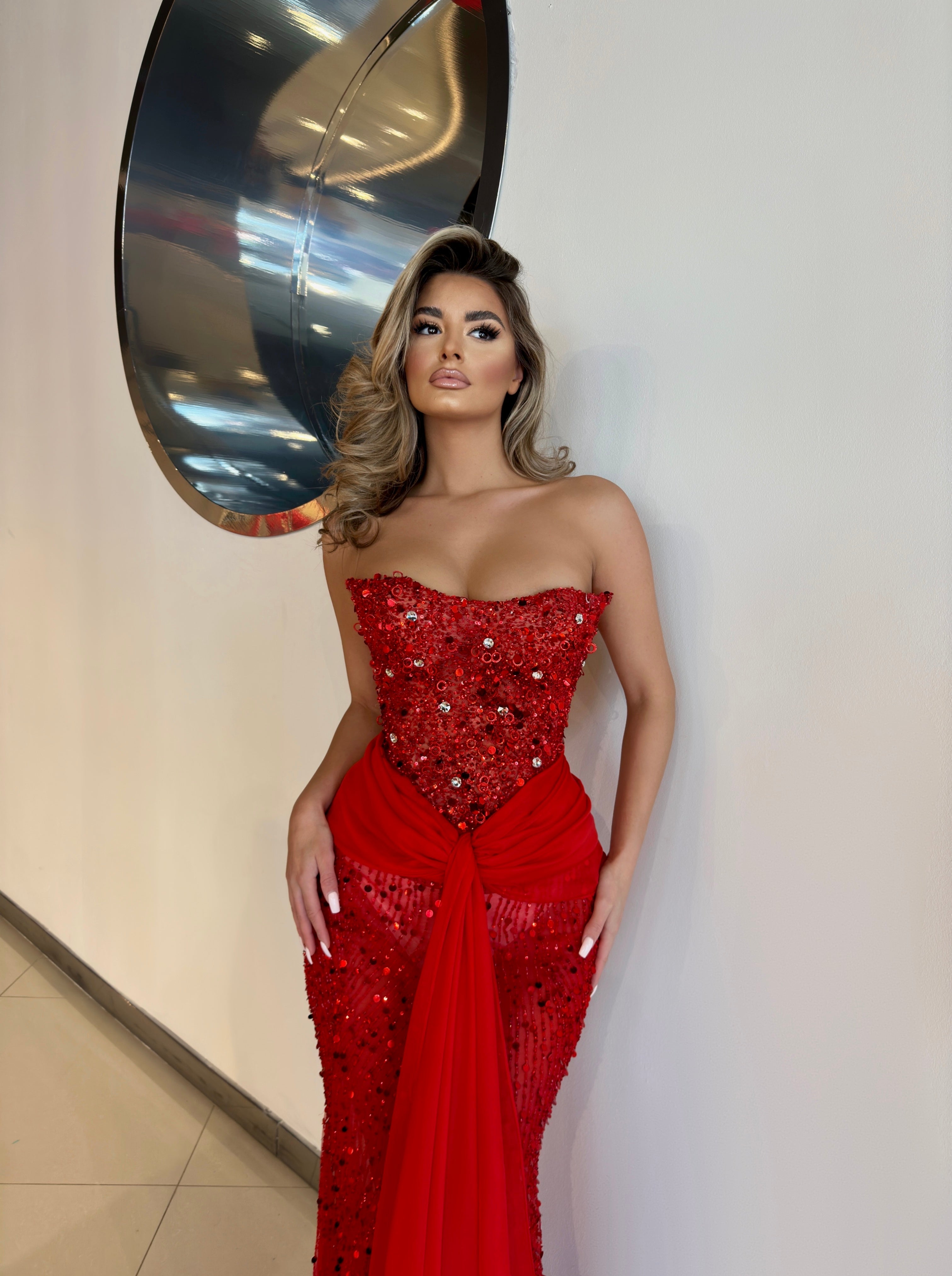 Curio Collection’s "Lexley Dress". This stunning red draped evening dress is intricately hand made from scratch and will most definitely make a statement at any glamorous event x