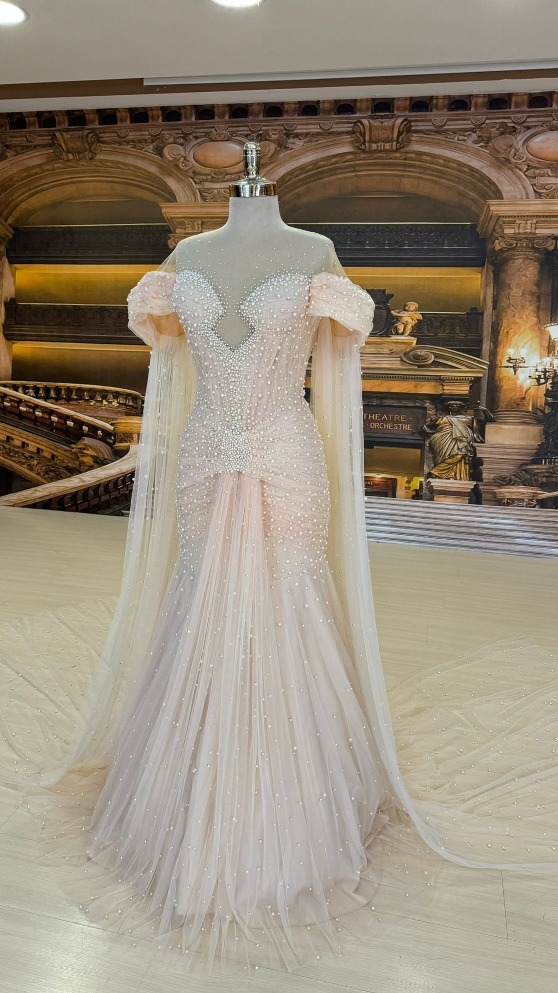 The romantic off-shoulder neckline is framed by delicate tulle draping that flows effortlessly into a dramatic shoulder cape. The cape falls softly to the floor, creating graceful movement and an unforgettable bridal presence with every step.