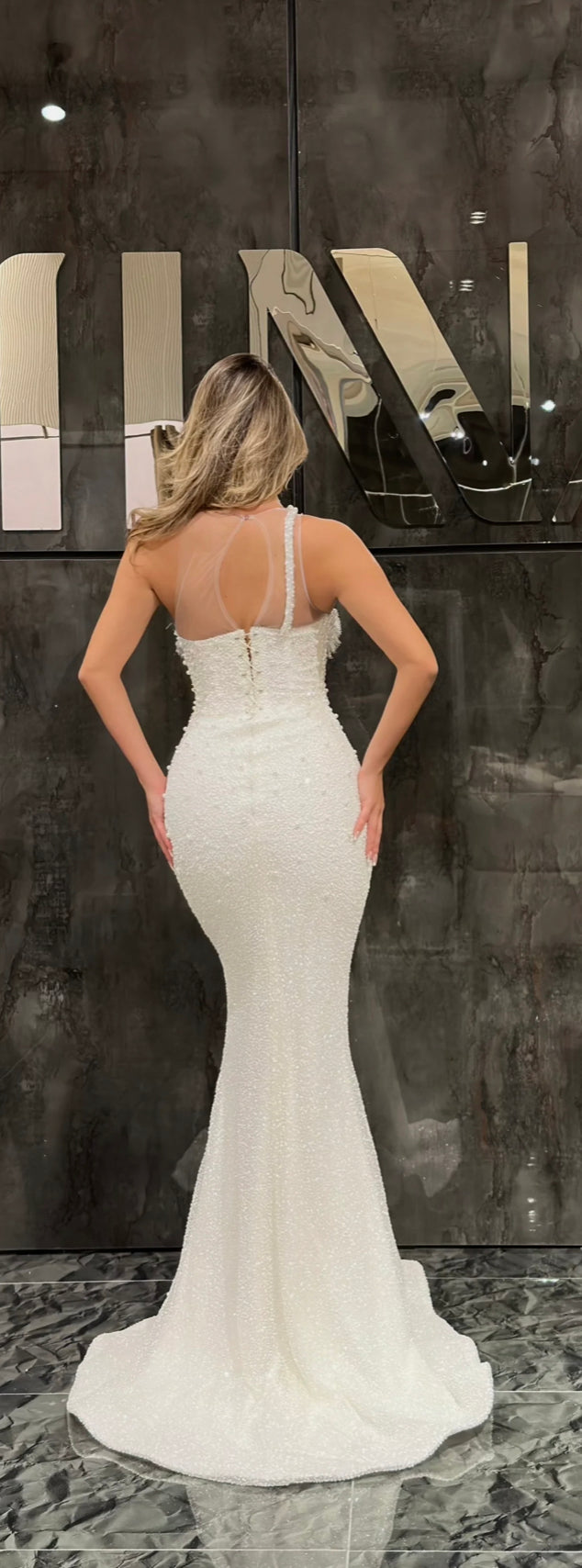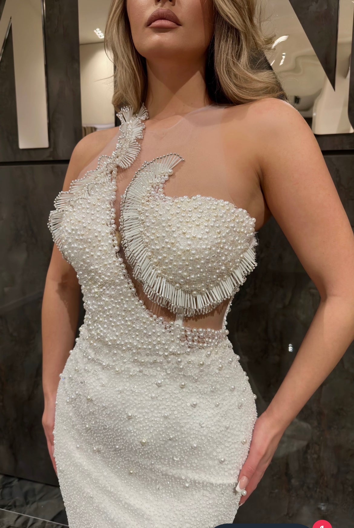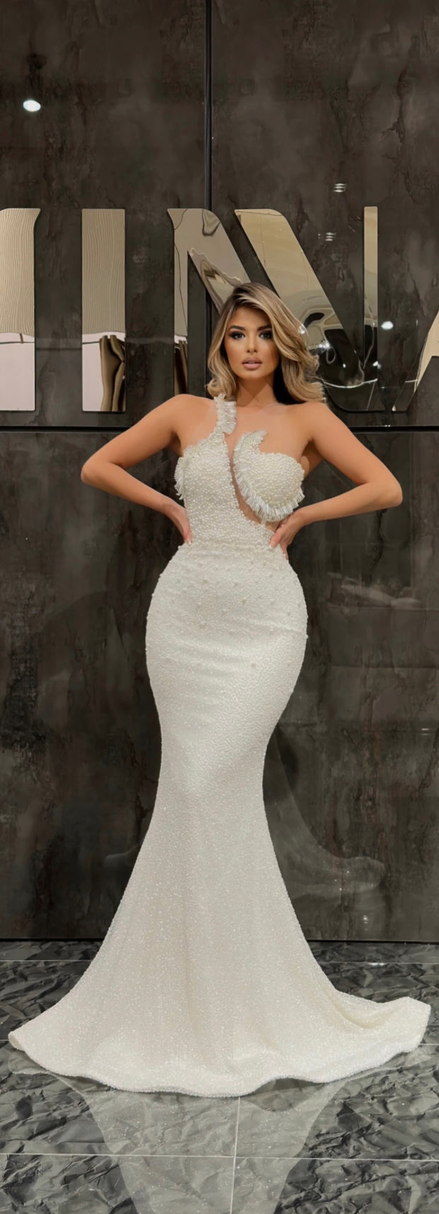 Curio Collection’s "Senga Dress". This stunning one shoulder pearl detailed wedding gown is intricately hand made from scratch. As with all of our dresses, they can be created bespoke to you and perfectly made to measure x